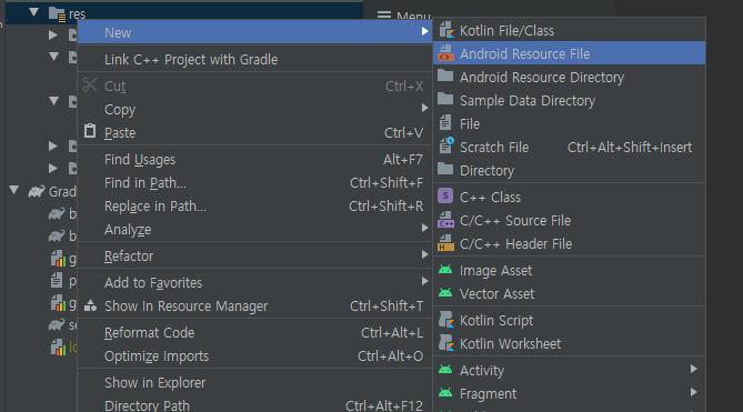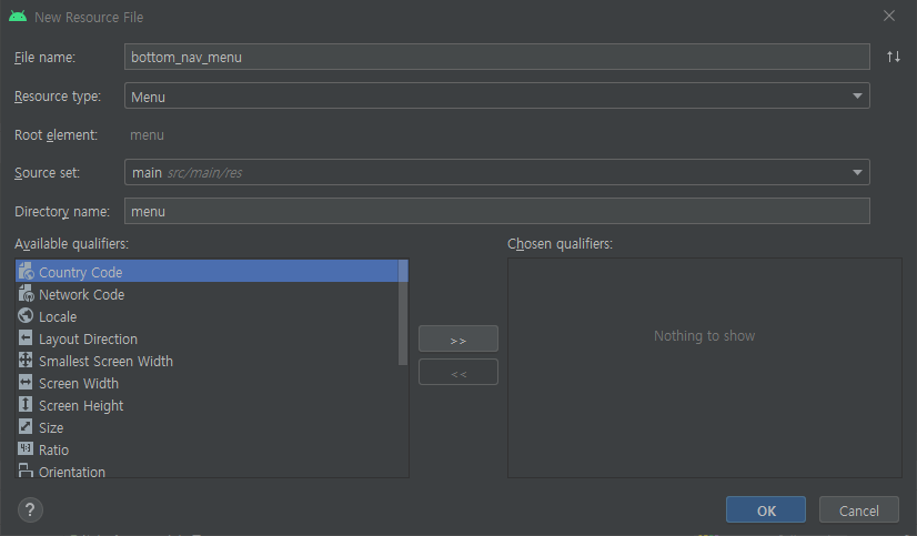 Resource type:Menu / File Name 입력 > OK 버튼 클릭