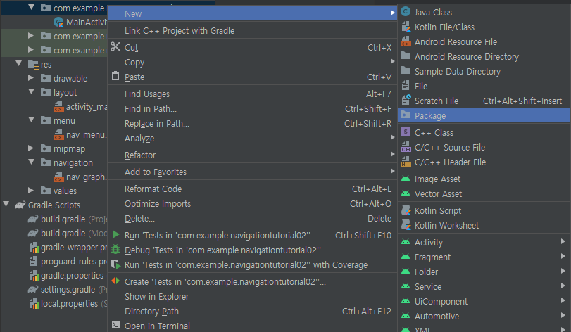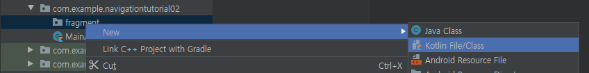 com.example.navigation_tutorial 마우스 우측버튼 클릭 > New > Package 선택